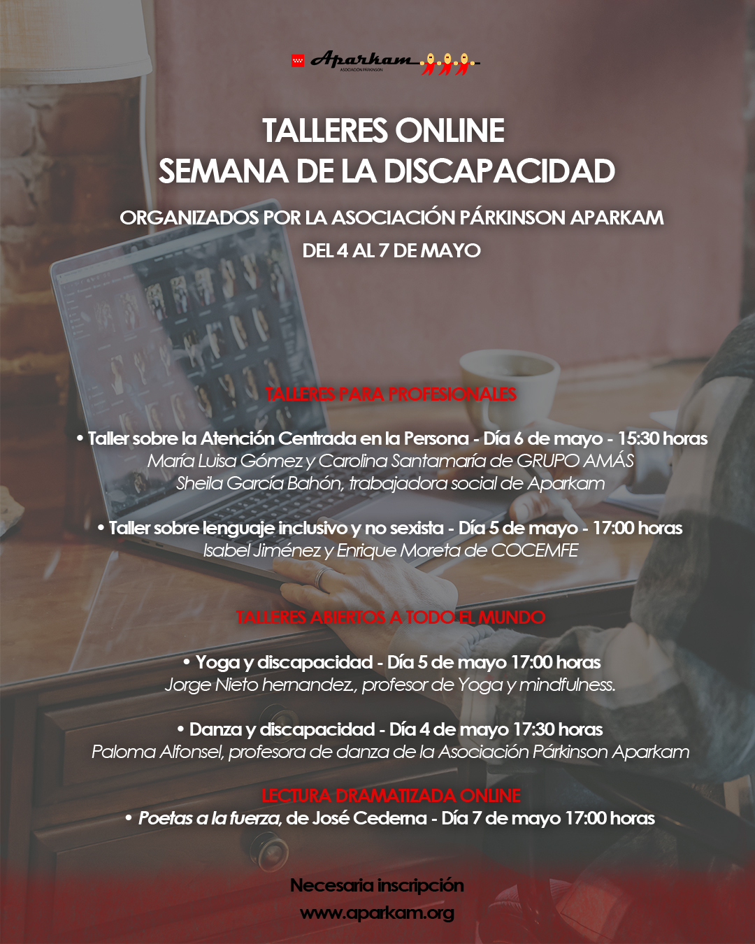 La Asociación Párkinson Aparkam ha organizado dos grandes bloques de talleres online para la Semana de la Discapacidad que se desarrolla entorno al 3 de mayor, Día Nacional de la Convención de los Derechos de las Personas con Discapacidad.
