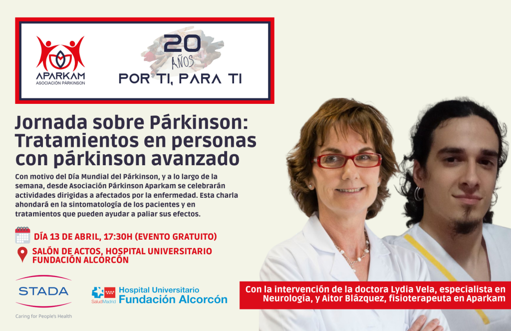 La Asociación Párkinson Aparkam ha promulgado la Jornada sobre Párkinson «Tratamientos en personas con párkinson avanzado» el próximo día 13 de abril a las 17:30h en la Fundación Hospital de Alcorcón. APARKAM -con el apoyo de Laboratorios Stada– ha impulsado esta charla gratuita dentro del marco de actividades que se desarrollarán para conmemorar el Día Mundial del Párkinson, que se celebra el día 11 de abril.