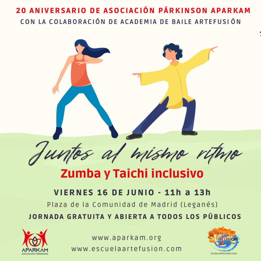 Este próximo viernes 16 de junio la Asociación Párkinson Aparkam – con la colaboración de la escuela ArteFusión de Leganés – celebrará su 20 aniversario con un evento de baile al aire libre en la Plaza de la Comunidad de Madrid (Leganés). Bajo el lema “Juntos al mismo ritmo”, esta actividad gratuita ofrecerá de 11h a 13h clases de Taichi y Zumba adaptadas a todo tipo de públicos.
