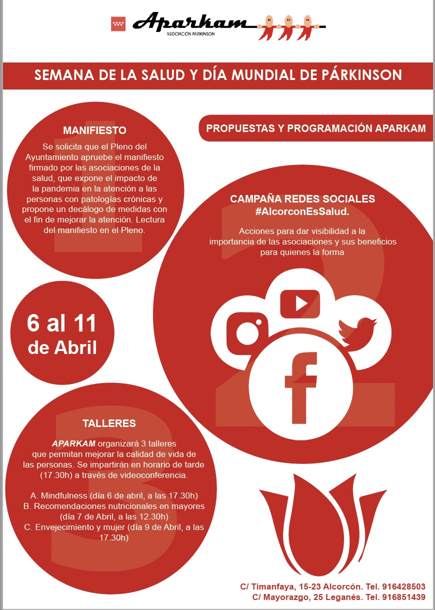 Durante la Semana de la Salud, que se desarrolla desde el 6 al 11 de abril. la Asociación Párkinson Aparkam organiza tres talleres online abiertos a toda la ciudadanía, para los que es necesaria inscripción en este enlace. El objetivo de los mismos es mejorar la calidad de vida de las personas y se impartirán a través de videoconferencia. Estos talleres se incluyen en las actividades oficiales que los ayuntamientos de Leganés y Alcorcón celebran.