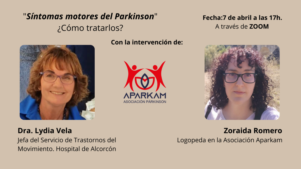 En el marco de la Semana de la Salud y del Día Mundial de las personas con Parkinson, Aparkam ha organizado, hoy 7 de abril una sesión online en ZOOM para hablar sobre los “Síntomas, tratamiento y calidad de vida en personas con Parkinson”. Las ponentes de esta reunión han sido: la doctora Lydia Vela, Jefa de Neurología y experta en trastornos del movimiento en el Hospital de Alcorcón y, Zoraida Romero, Logopeda en Aparkam.